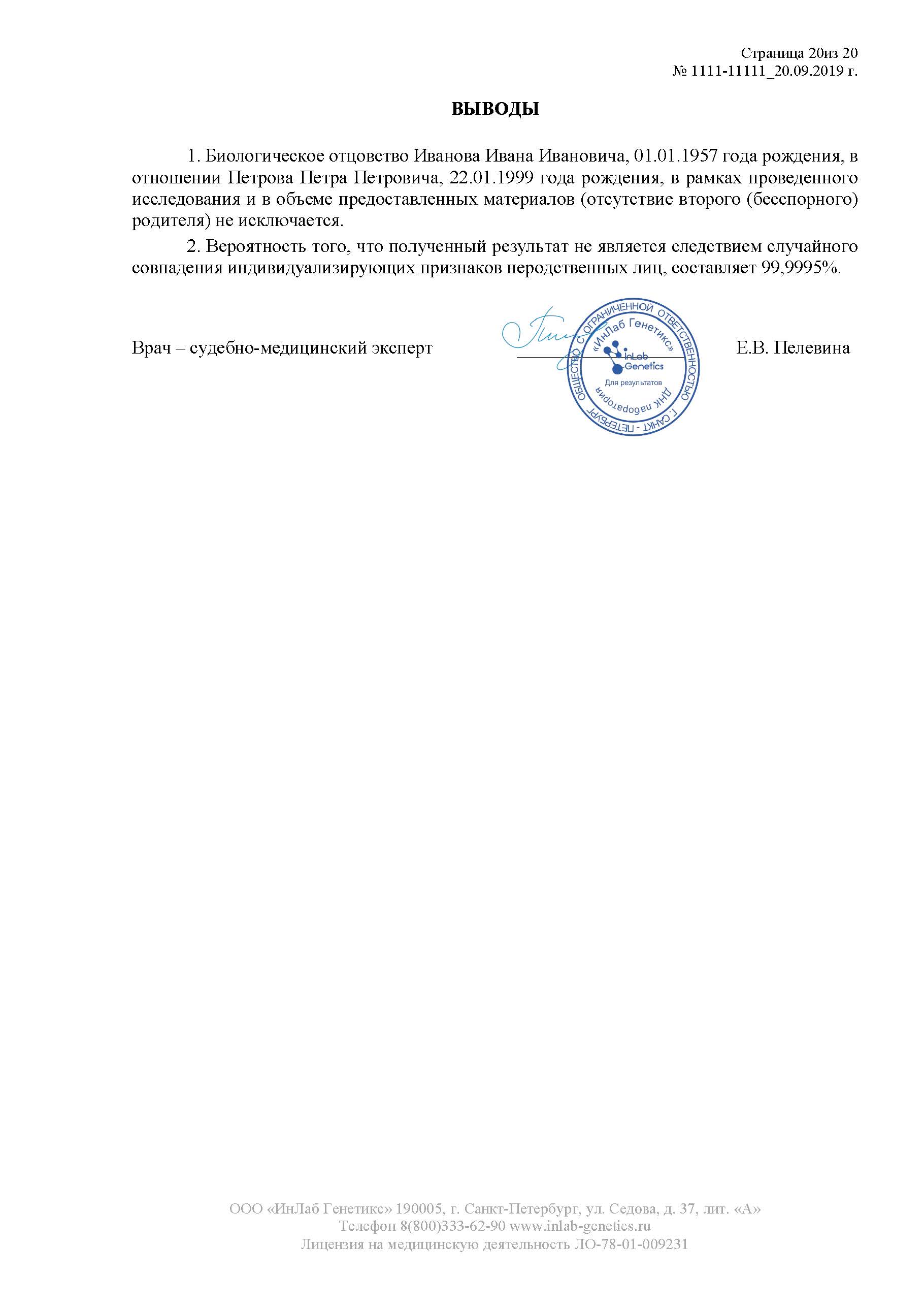 Мы проводим судебно-генетическую экспертизу на родство в строгом соответствии с законодательством РФ и соблюдением всех процессуальных нормативов. В результате экспертизы будет подготовлено исчерпывающее экспертное заключение. Это многостраничный прошитый документ, содержащий всю необходимую для суда информацию, который заверяется печатью лаборатории и подписью эксперта-генетика.